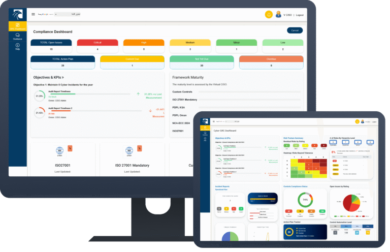 Monitor risks, map controls, and automate compliance from a single platform. Ensure alignment with ISO, GDPR, PDPL, and more.